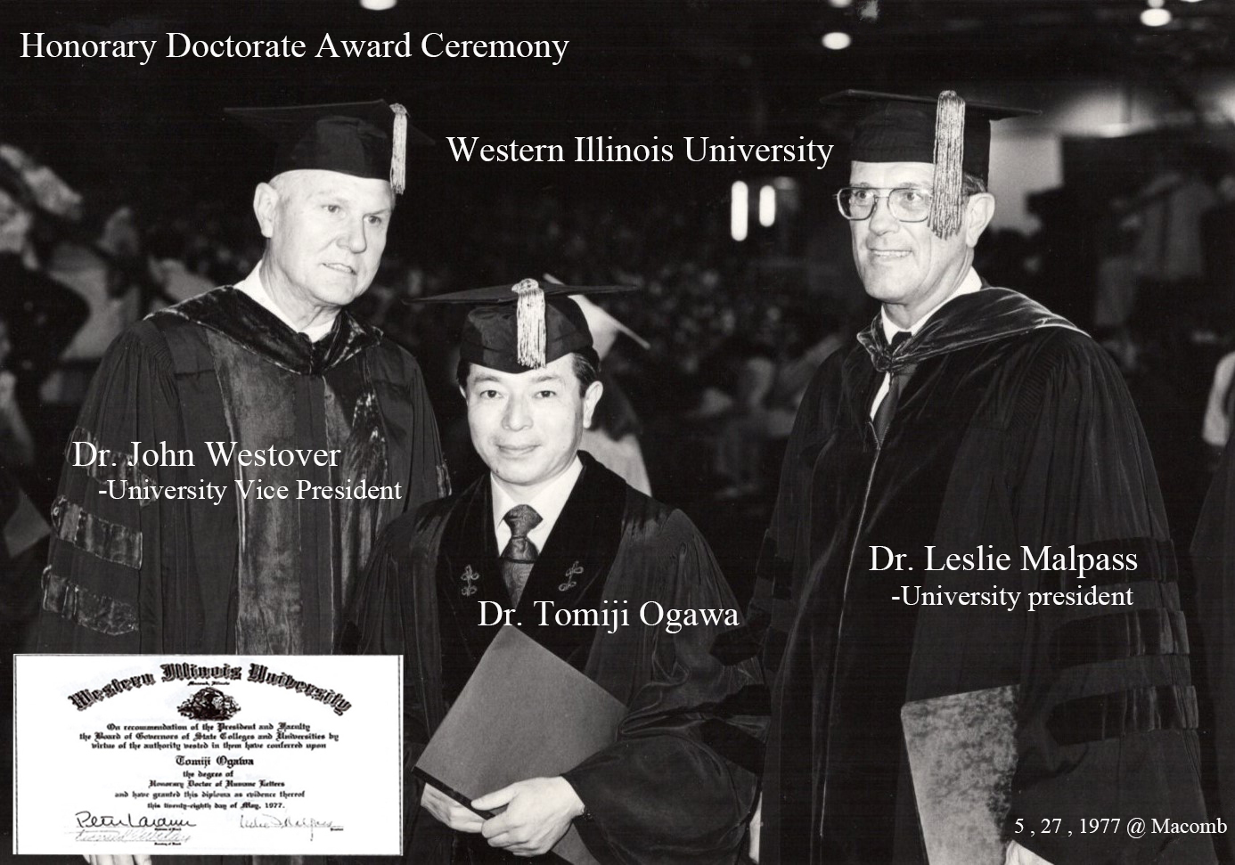 ◆1966年には、西イリノイ州立大学から日本史の客員教授として招聘されましたが、教えるよりも学ぶことのほうが多い日々でした。ミシシッピ河での魚釣り、リンカーン、ヘミングウェイの生家, 帝国ホテルを設計したフランクロイド・ライトの工房を訪ねたり、百聞は一見にしかず、こうして身につけた雑学が教壇でも本を書くときにも役立っています。創立1899年の州立大学から<第2外国語としての英語研修所WESL>設立貢献者のひとりとして、1977年には日本人では初めての名誉文学博士号を授与された。Honorary Doctor of Humane Letters。1975年から1978年にかけては、日本人学生の留学斡旋機関で米国人教師も雇用していた現地法人ISAバークレー語学研修所々長をつとめたので UCLAをはじめ、サンタバーバラ校、ほかUCの大学、モントレーの米国海軍大学院の儀礼訪問もできた。①西イリノイ大学の所在地イリノイ州のマッコーム ②スヌーピーゆかりのカリフォルニア州は薔薇の美しいサンタロザの名誉市民。日本では、産能短大、朝日カルチャー(立川、新宿、千葉)NHK文化センター(ユーカリが丘) 淑徳大学の客員教授、海上自衛隊の第2術科学校(横須賀市田浦)幹部専修科英語特別課程のTOEFL集中講座の講師を10年つとめたので、相模湾上の国際観艦式、観桜園遊会、日米海軍の親善行事にも参加することもできた。